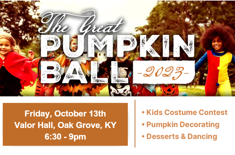The First Annual Great Pumpkin Ball will be Friday, October 13th, at Valor Hall in Oak Grove Kentucky! Get ready for a Halloween Bash like no other! It's time to put on your best costumes and join us for a frightfully fun evening of bone wiggling dancing! Reveal your most eerie ensemble during our costume contest and indulge in spine-chilling eats and treats! Please, no scary costumes!